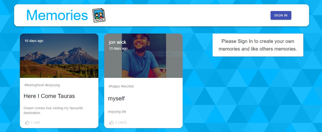 Using React, Node.js, Express & MongoDB. The App is called Memories and it is a simple social media app that allows users to post interesting events that happened in their lives.