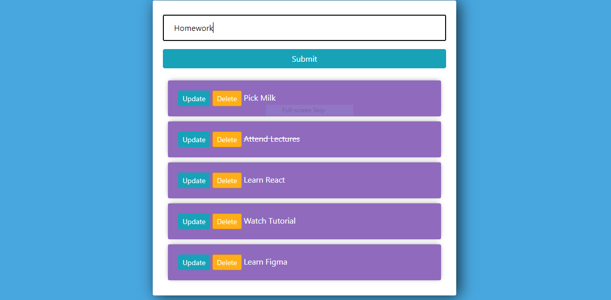 Todo list allows everyone to keep track of their daily routines it has update and delete functionalities to keep your record always perfect and organize